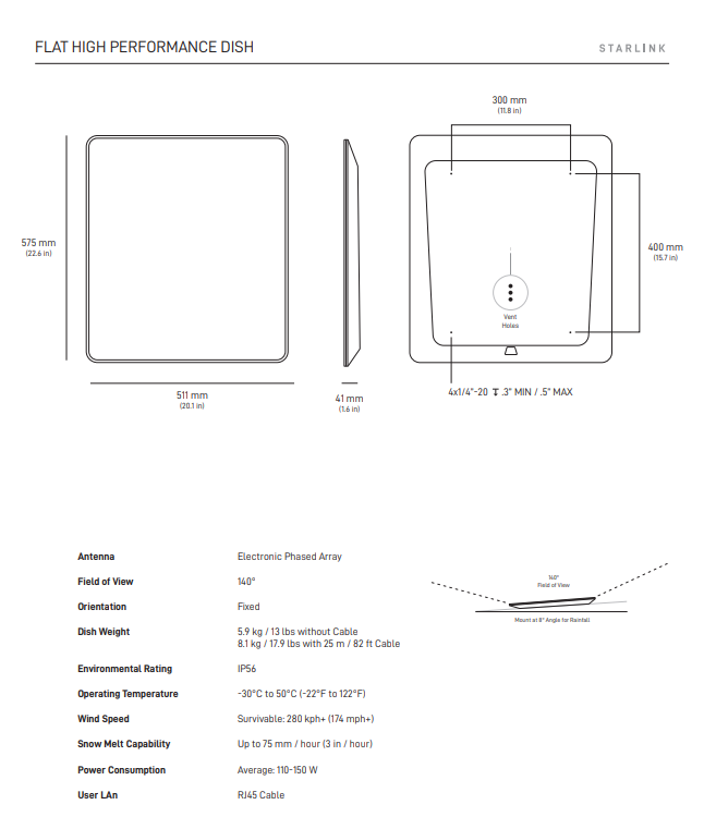 Wide 140° field of view — allowing it to see 35% more sky than standard consumer dishes for better performance in obstructed, polar, equatorial, or in-motion scenarios.