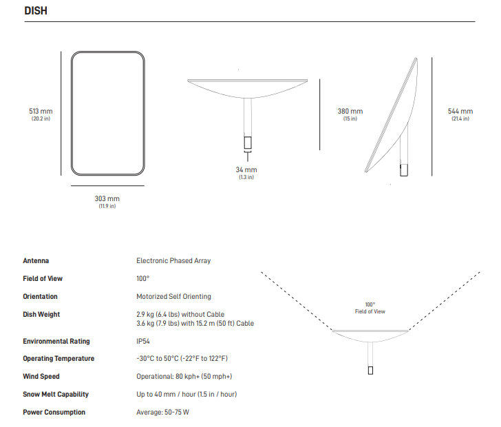 110° field of view with software-guided setup (point the dish toward the sky for best satellite coverage).
